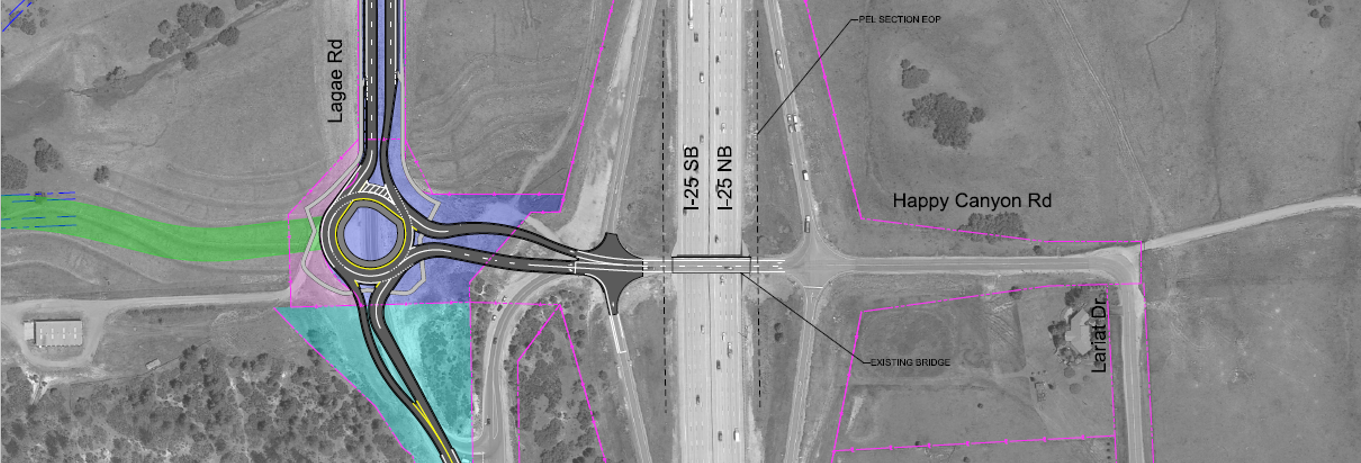 Construction of the roundabout is expected to be completed by July 2024. This work will be completed as a part of an early action item for the eventual improvements to the I-25 and Happy Canyon Road bridge and interchange.